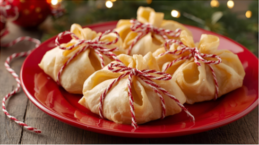 Vrolijke filodeeg buideltjes met geitenkaas en spek.
