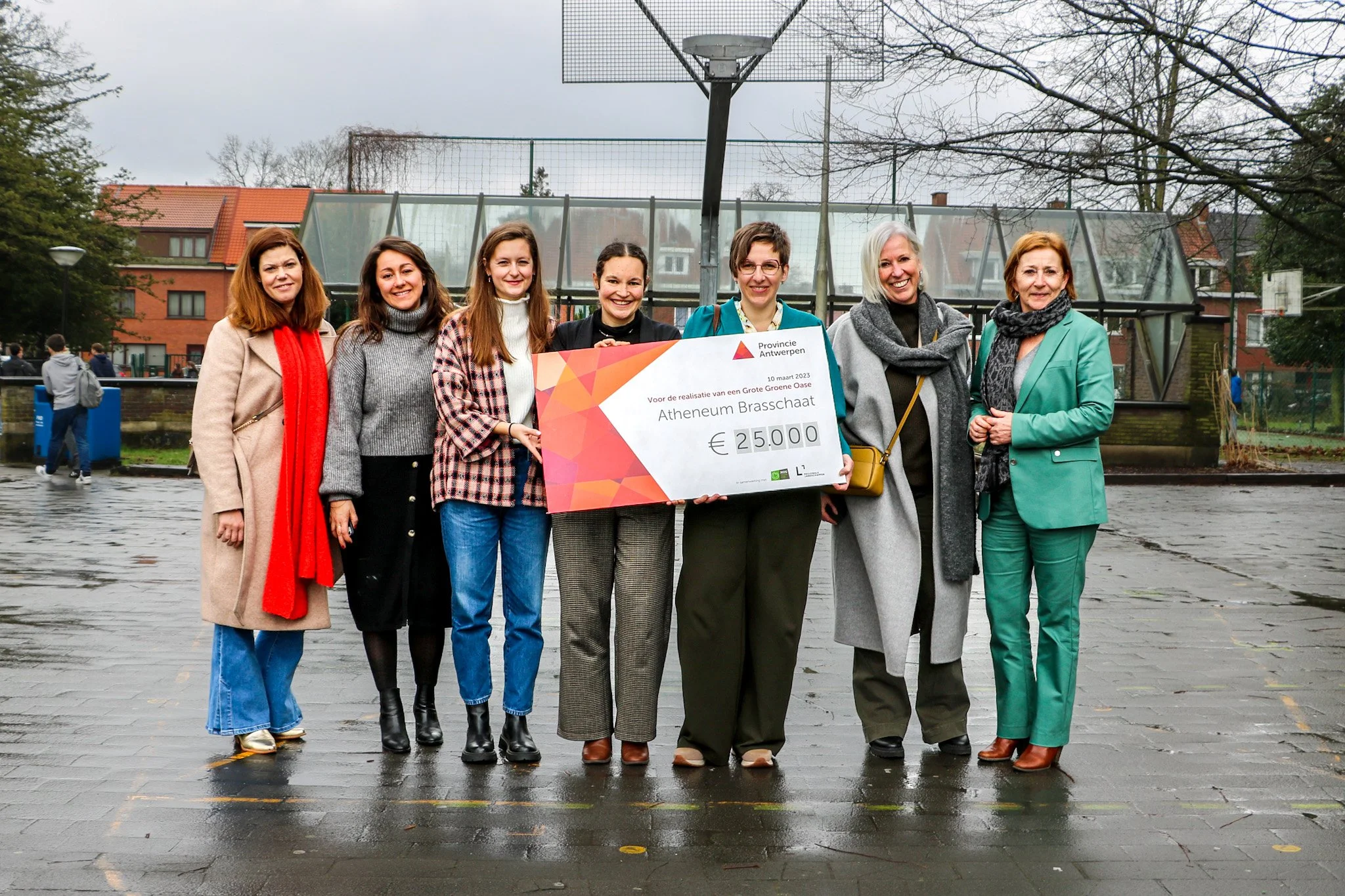 In totaal kwamen 93 scholen uit de provincie Antwerpen in aanmerking voor financiële ondersteuning bij de ontharding en vergroening van hun speelplaats. Het project van het Atheneum was kennelijk een voorbeeld voor velen. Luk Lemmens, bestendig afgevaardigde van de provincie Antwerpen, en zijn team kwamen vrijdag persoonlijk de cheque overhandigen op school.